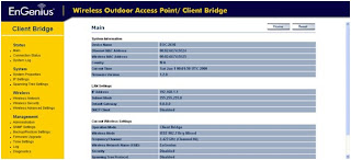 1. Berikutnya atur konfigurasi untuk client bridge yang berfungsi untuk mengkoneksi ke access point, disini client bridge menggunakan en-genius eoc-2610 yang akan mengoneksi ke acces point dengan hanya menggunakan SSID nya saja.